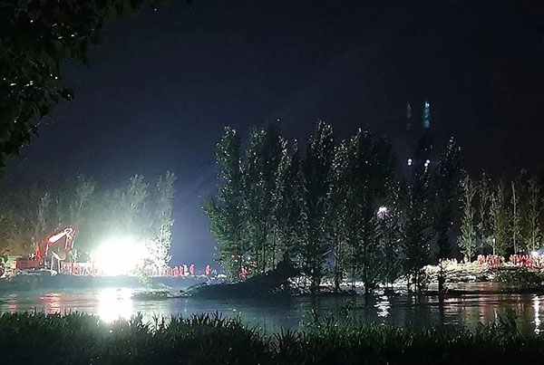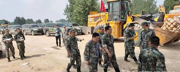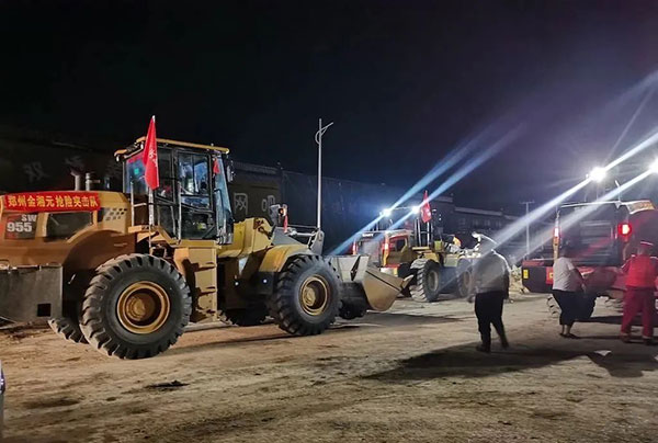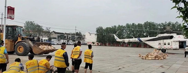 7月23日下午,河南省政府增派直升飞机参与封堵工程,用尼龙纱网装沙袋吊到决口上方,抛投封堵,郑州金湘元4台三一装载机直接参与沙袋运输工作。当晚,郑州金湘元2台装载机、8位湘元战友,参与夜间备料工作,狂干一个通宵。