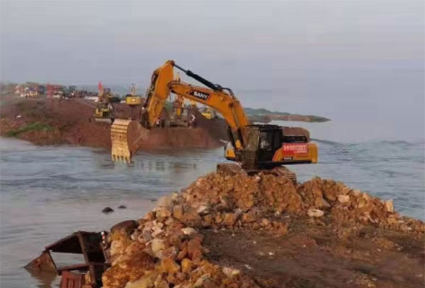 郑州金湘元24日已经动用7台三一装载机(其中5台新机)、2台加长臂三一挖机、2台推土机(租用),连同组织的客户、驾驶员在内有近60人参与此处抢险工程,截止24日晚21时,相关人员和设备状况安好,预计卫河决口封堵25日将合拢。