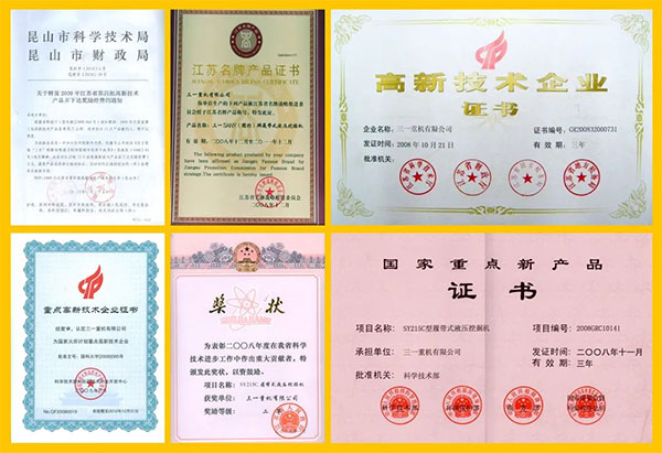 三一重机所获的部分荣誉证书