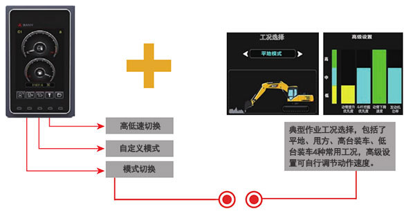 显示屏中除了常规的标准、重载、轻载、破碎4种模式外,增加3组客户自定义模式,让客户更加精准地匹配工况,在最大限度地满足作业工况的同时,降低燃油消耗,真正做到高效节油。