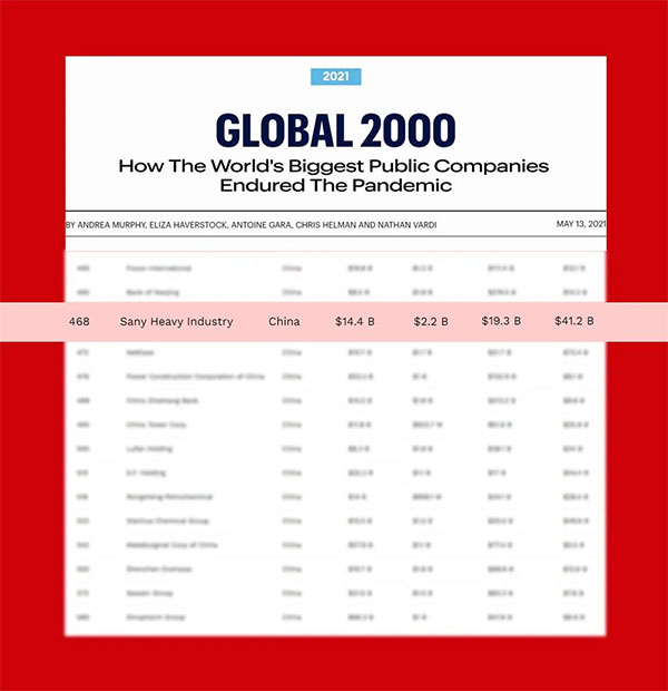 5月13日晚,《福布斯》发布2021年全球企业2000强,其中,三一重工排名总榜单第468位,首次跻身全球企业500强,排名较去年大幅上升235位,是榜单中排名中国第一、全球第二的工程机械企业,也是中国工程机械行业第一家《福布斯》全球500强。