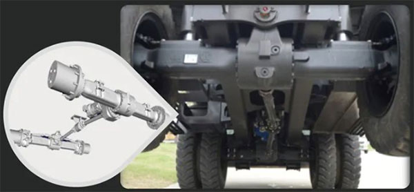 全时四驱,行走马达通过变速箱、差速器直接驱动四轮,可应对各种路况;高达80KN的驱动力,使整车具备超强的脱困能力;变速箱360MM离地间隙、49度接近角、28度离去角,确保极佳的越野性能。