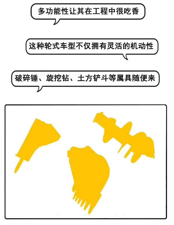 对轮挖的描述中,有一个比喻非常贴切,那就是——工地上的“百变马丁”。一位轮挖业内人士这样形象地介绍了轮式挖掘机。