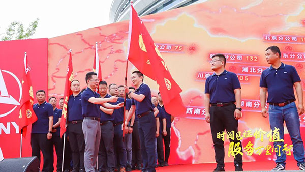 授旗仪式环节上,三一重机营销公司总经理李练文先生向五大战区、桩机纵队授旗,三一重机海外营销公司总经理徐庆伟先生向国际纵队授旗,各区域代表们承诺巡检标准动作100%执行,客户100%满意。