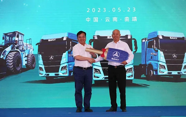 交付仪式上,三一集团副总裁周万春向呈钢集团董事长刘炜交付金钥匙,三一首批130台电动牵引车、11台电动自卸车、10台电动装载机、5台电动搅拌车、3台电动挖掘机、1座充换电站,即将全面投入呈钢及滇中好运物流运输项目中。