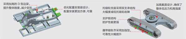 矿山型下车:矿山专用重载型四轮一带设计,主车架截面加高,履带护板结构加强,坚固耐磨,稳定可靠。履带采用高强度特殊钢材轧制三齿板,接地性更好、稳定性更高、耐用性更强。