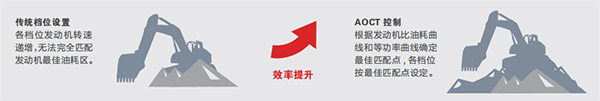 AOCT自寻优控制系统:采用AOCT自寻优控制技术,根据不同作业工况,实现了各档位、模式都工作在发动机最佳油耗区、主泵高容积效率区,实现发动机与主泵的完美匹配,从而达到高效率、低油耗的卓越性能。