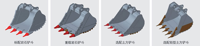 铲斗升级:前刃板加厚至60mm,优化机构运行轨迹及斗型,减小挖掘时对机器冲击和阻力,作业效率提升,铲斗使用寿命延长一倍。可配置4种系列化铲斗,满足“一况一斗”,提高施工效率,轻松应对多种复杂工况。