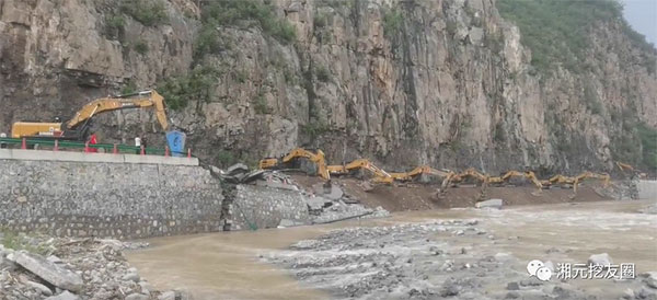 但灾情就是命令,风雨当前,我们与时间赛跑,向困难挑战!在井陉县交通局组织的救援活动中,挖掘机组队出征,抢修道路,全力保障交通安全。现场使用挖掘机就地取材,使用河道中的砂石进行路基填方并压实,快速抢修。