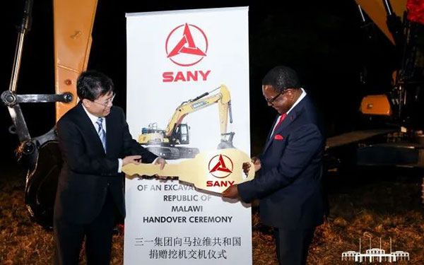 9月11日下午,马拉维总统府,副省长、省公安厅厅长王一鸥向查克维拉总统交付三一集团捐赠的挖掘机