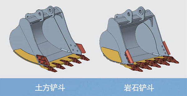 标配土方铲斗,可选配岩石铲斗,实现“一况一斗”,满足不同工况作业需求。